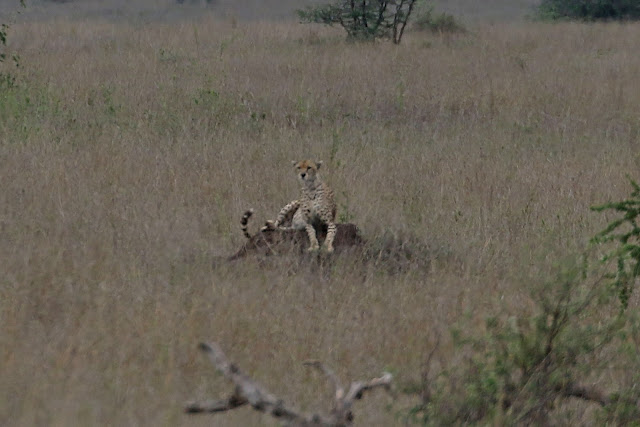 We continued, then Helen called to stop, she had seen something in the grass. Her actions were dead right. Sitting upright on a termite mound was a Cheetah. Then it lay down. It was distant, but definitely a Cheetah. One off the list already.